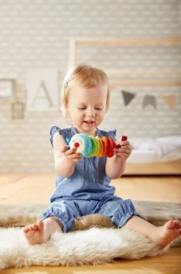 Wird diese farbenfrohe Raupen-Spielfigur auseinandergezogen, zieht sie sich dank lustigem Rattermotor von alleine wieder zusammen.