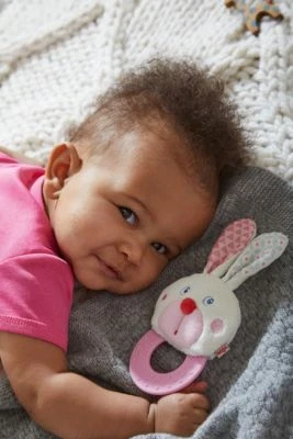 Dieses süße Häschen wird Babys begeistern! Während der Kopf und die Ohren ganz weich und kuschelig sind, hält der Beißring so einiges aus und massiert sanft das Zahnfleisch der Kleinen. Tolle Details wie die gestickten Augen und Wangen-Verzierungen machen das Häschen zu einem echten Eyecatcher.