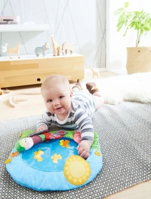 HABA Wasser-Spielmatte Bauernhof. Diese Wasser-Spielmatte ist ein Erlebnis für alle Babys und zeigt spannende Motive aus dem Bauernhofleben. Hier gibt es viele optische, haptische und akustische Spielelemente zum Erkunden. Babys können alle Elemente im Wasser leicht mit ihren Händen hin und her bewegen. Das macht Spaß, stärkt die Muskulatur und fördert die Motorik in Bauchlage. Die Wasser-Spielmatte ist von einer weichen Stoffhülle umgeben, sodass Babys angenehm liegen.