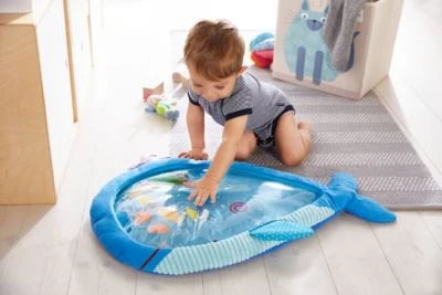 Diese Wasser-Spielmatte ist ein Erlebnis für alle Babys und zeigt spannende Motive und Bewohner der Unterwasserwelt. Hier gibt es viele optische, haptische und akustische Spielelemente zum Erkunden. Babys können alle Elemente im Wasser leicht mit ihren Händen hin und her bewegen. Das macht Spaß, stärkt die Muskulatur und fördert die Motorik in Bauchlage. Die Wasser-Spielmatte ist von einer weichen Stoffhülle umgeben, sodass Babys angenehm liegen.