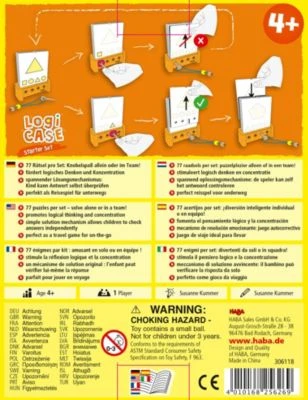 Mit dem Lernspiel LogiCase Starter Set 4+ von Haba schulen Kinder ihre Problemlösungskompetenz. Das kompakte Spiel fördert das logische Denken und die Konzentration. ab 4 Jahren 1 Spieler 40 Rätselkarten mit 77 Rätseln, 1 kleine Karte (Blende), 1 Rätselbox, 1 Holzstift mit Schnur und Kordelstopper Lernspiel Das Lernspiel LogiCase Starter Set 4+ von Haba stellt Kinder ab vier Jahren vor kleine Herausforderungen. Es gilt, Rätsel zu lösen und die Antworten anschließend eigenständig auf Richtigkeit zu überprüfen. So trainieren Kinder, eigenständig Probleme zu meistern. Gleichzeitig werden die Konzentration und das logische Denken geschult. Durch die farbenfrohe und kindgerechte Gestaltung lädt das Set zum Spielen ein. Es ist dabei so kompakt und handlich, dass es sich auch als Reisespiel eignet. Mit verschiedenen Erweiterungspacks kann das Spiel um weitere Themenschwerpunkte und Schwierigkeitsgrade ergänzt werden.