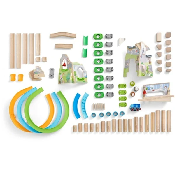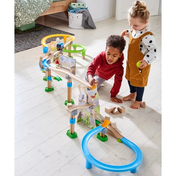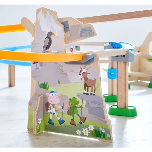 Diese große Kugelbahn aus der HABA-Serie Kullerbü ist eine wahre Berg- und Talfahrt! Mit dem LKW oder den Kugeln geht es bergauf und bergab, durch gleich drei Spiralkurven, ein klingendes Glöckchentor, vorbei am Steinschlag und danach zur Bergstation. Hinter der Geröllschranke wartet die Dominotreppe und ganz am Ende werden noch 6 Dominosteine umgeschubst. Mit dem einfach zu handhabenden Klicksystem ist dieses große Set schnell zusammengebaut und außerdem mit allen anderen Produkten der Kullerbü-Serie kombinierbar. Art.-Nr.: 1731349