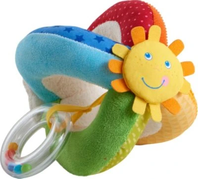 Der Stoffball von Haba regt mit verschiedenen Materialien und Strukturen zum Greifen, Tasten und Entdecken an. Stoffball Regenbogenwelt von Haba buntes Design mit verschiedenen Stoffen und Strukturen rasselnder Greifring mit bunten Kugeln, Knisterfolie haptische und akustische Effekte aus Textil ab 6 Monaten geeignet Der Stoffball von Haba fördert die Feinmotorik und die sensorische Entwicklung von Kindern. Verschiedene Oberflächen-Strukturen und Spiel-Elemente animieren zum Greifen und Erleben. Der Ball ist zudem mit einem rasselnden Greifring mit bunten Kugeln und Knisterfolie versehen. So spricht das Spielzeug verschiedene Sinne an. Auch das bunte Design bietet einen optischen Anreiz. Kindern ab sechs Monaten bereitet der farbenfrohe Spielball langanhaltenden Spaß.