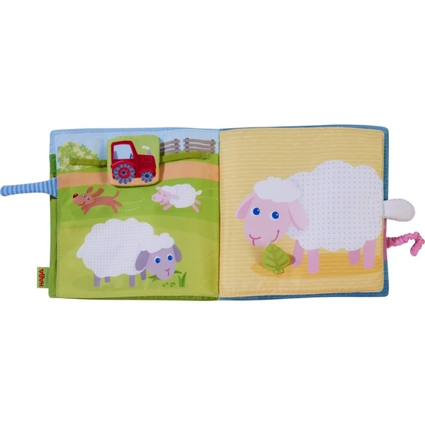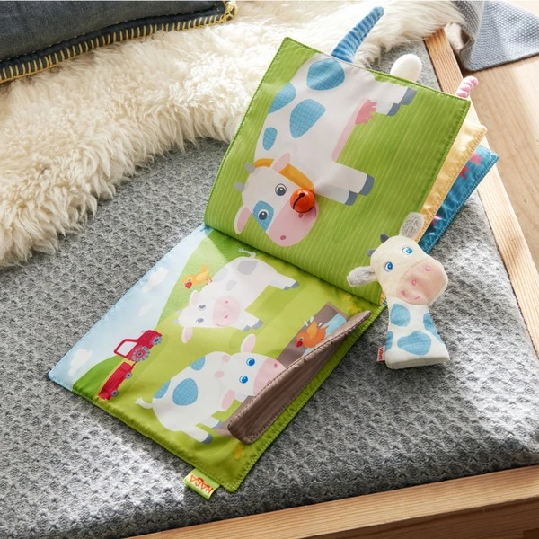 Eine lustige Kuh begleitet Kinder ab 6 Monaten als Handpuppe durch dieses lustige Stoffbuch zum Thema Bauernhof. Dabei trifft sie andere Bauernhoftiere. Mit Klappen, Quietsche, Spiegelfolie und tollen Fühl- und Spielelementen gibt es dabei auf sechs Seiten viel zu entdecken. Art.-Nr.: 1731585